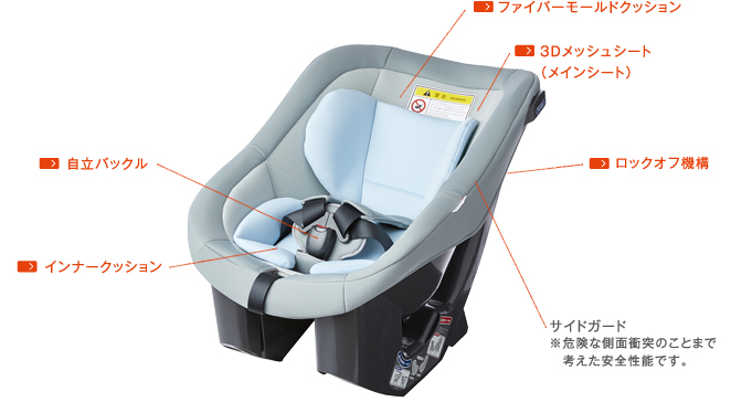| チャイルドシート本体には、立体メッシュ素材を採用。通気性にすぐれ、熱がこもりにくいため、一年中快適に使用できます。 | ![]() |