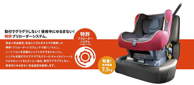 タカタ独自のプリローダーシステムは、シートベルトで取り付ける際のグラつきや緩みを解消し、ハンドルを回すだけで女性でもガッチリ固定が可能。
