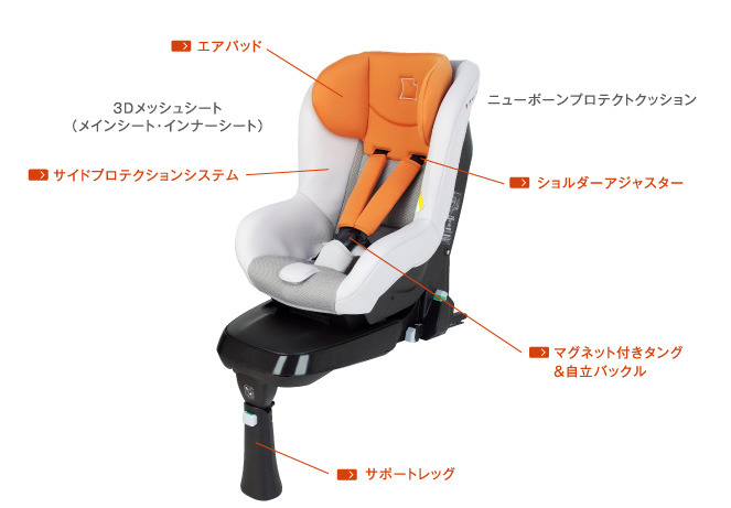 | 自動車用エアバッグをつくる技術を応用したタカタ独自開発のエアパッド。特殊コーティングされたエアバッグ織布でウレタンフォームを包み込むことで、ウレタン内部は空気を含んだ状態となり、万一の正面衝突時には、内部の空気を逃しながら効果的に衝撃を吸収して、お子様の頭部をしっかりと保護します。また、お子様が寝てしまった時には、快適なエアクッションとしても機能します。 |