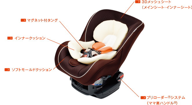 ハンドルを回すだけで強力に固定できる「プリローダー®システム(ママ楽ハンドル®)」が、チャイルドシートの取り付けミスを軽減。安全性能はもちろん、赤ちゃんの乗り心地も追求しました。国内基準初の「アセスメントW優」評価に輝いた人気モデルです。