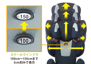 背もたれの高さと幅が連動し、さらにショルダーガイドの位置も成長に合わせて同時に変化します。