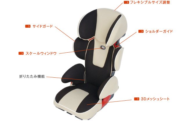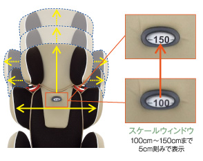ひと目で確認、身長が表示される「スケールウィンドウ」。身長に合わせて、頭部と肩部のガードが同時に動く「フレキシブルサイズ設計」でお子さまの体にジャストフィット。