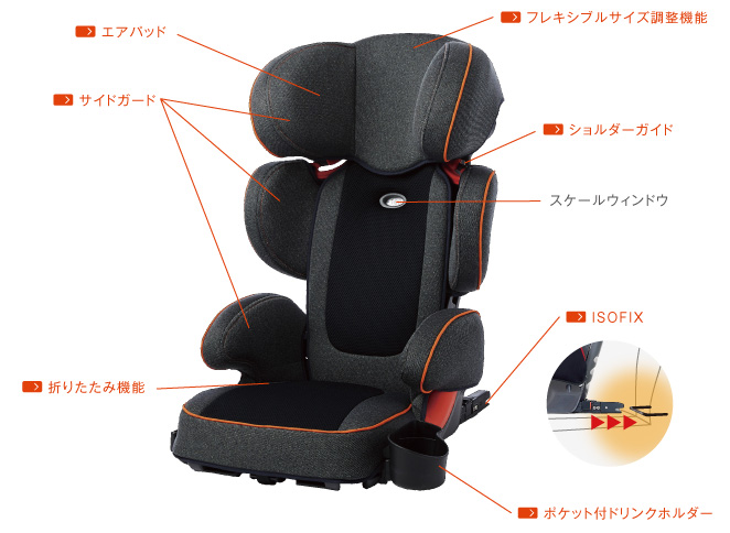 世界的な欧州のデザイン賞である「PLUS X AWARD 2014」や「GERMAN DESIGN AWARD GOLD 2016」を受賞し、ドイツのテスト機関(ADAC)でも高い安全性を評価されている欧州モデルのジュニアシート「TAKATA MAXI」。その日本国内向けモデルとして『Child Guard Junior』が新登場。ISOFIXでしっかり固定できるので安心。また、独自のエアパッドを採用し、子どもの安全性と快適性が向上しました。