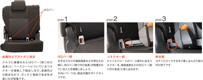 ISOFIX固定タイプの場合、クルマへの取り付けは、クルマの後部座席などに装備されたISOバー(取り付け金具)に、チャイルドシートのベース後方にあるコネクターを接合して固定するだけ。金属同士の結合なので、ガッチリ強固で安全性が高いのが特徴です。