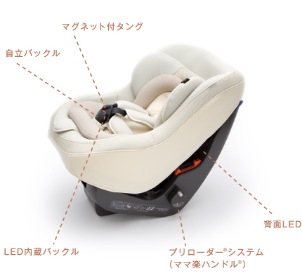 シートベルト固定タイプでは、独自に開発した「プリローダー®システム(ママ楽ハンドル®)をはじめ、お子さまの乗せ降ろし時のバックル操作が片手で行える「マグネット付タング」や「自立バックル」を採用。また、暗い車内での取り付け操作をスムーズかつ確実に行うために、バックル部と本体背面に「LED」を搭載したモデルもご用意しています。